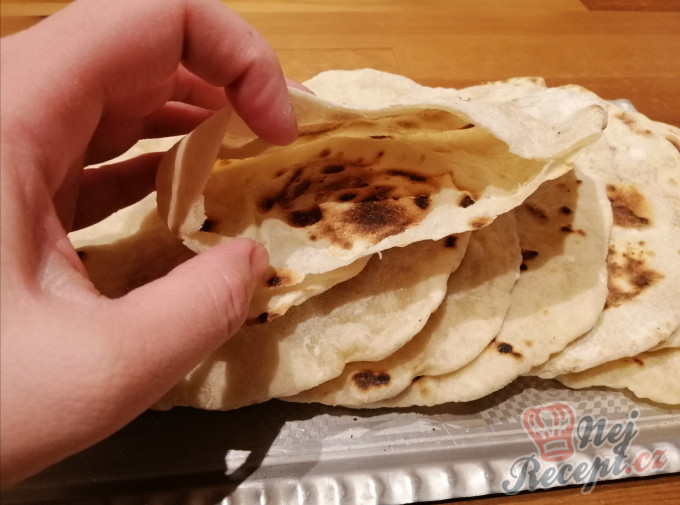 Pak každou kuličku rozválíme na tenkou placku a na suché pánvi opékáme z obou stran. Placky během pečení krásně nafouknou a tak je můžete opatrně překrojit a naplnit.